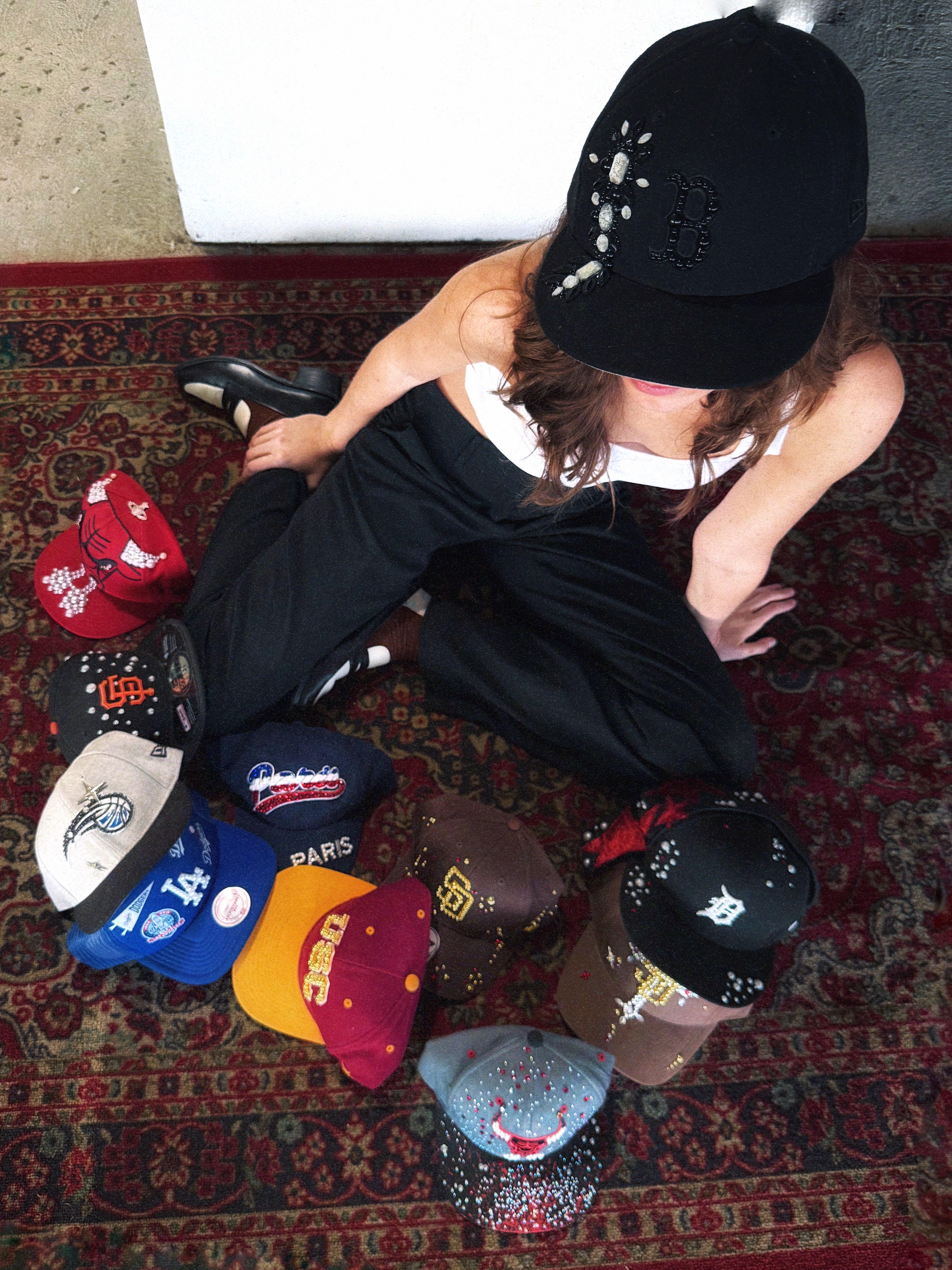 Original New Era fitted cap, customized by hand with precision embellishments. The Red Sox “B” logo has been fully reworked with black rhinestones, while a vertical cascade of crystal gems and black beadwork runs from crown to brim for a couture-inspired finish.