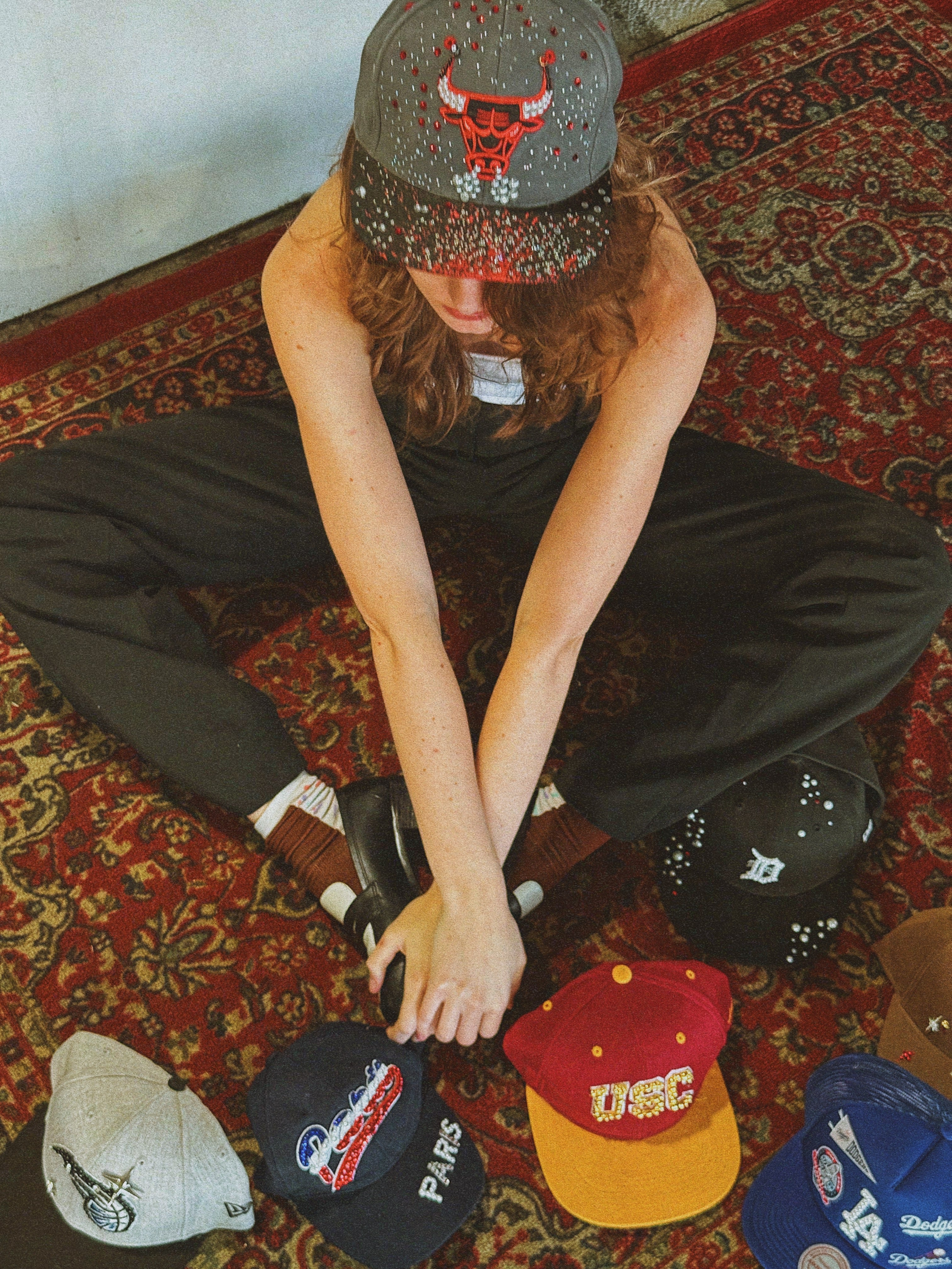 Original Mitchell & Ness Chicago Bulls snapback, rebuilt into a statement piece with hand-laid embellishments. The Bulls logo was reworked with pearl clusters on the horns and muzzle, accented with rhinestones and protective evil eye beads. The brim features a red/black/white splatter finish, sealed for lasting texture.