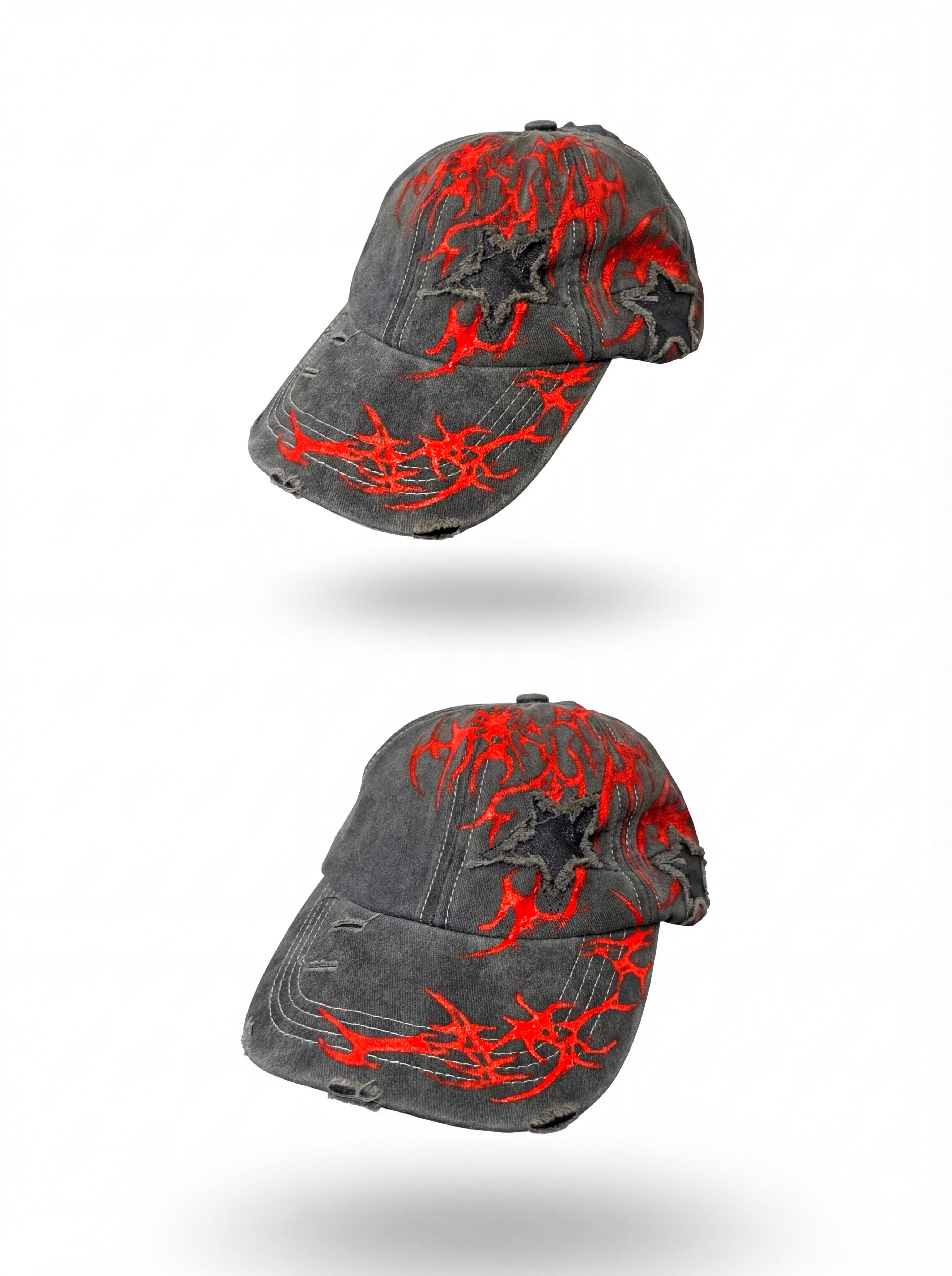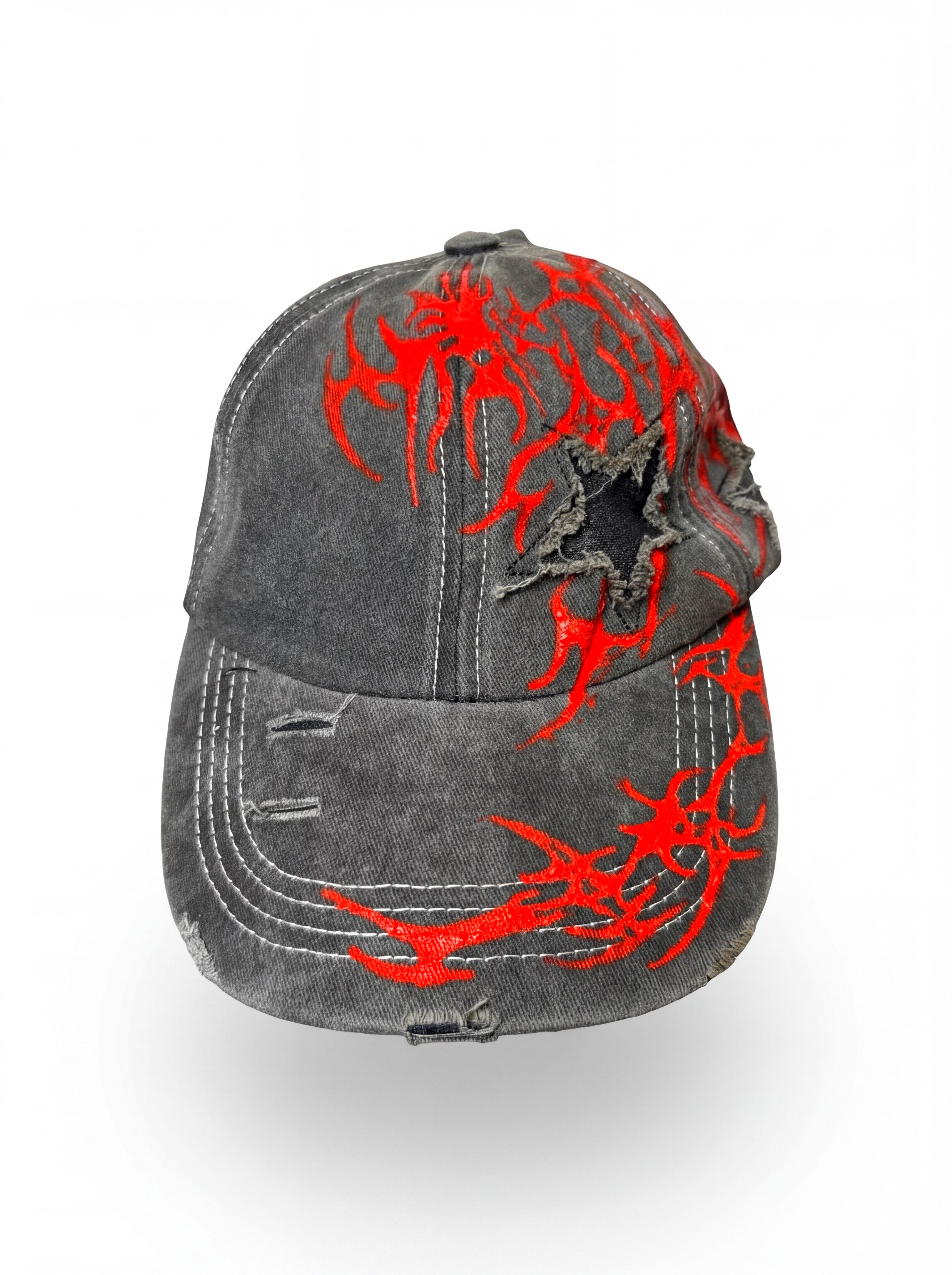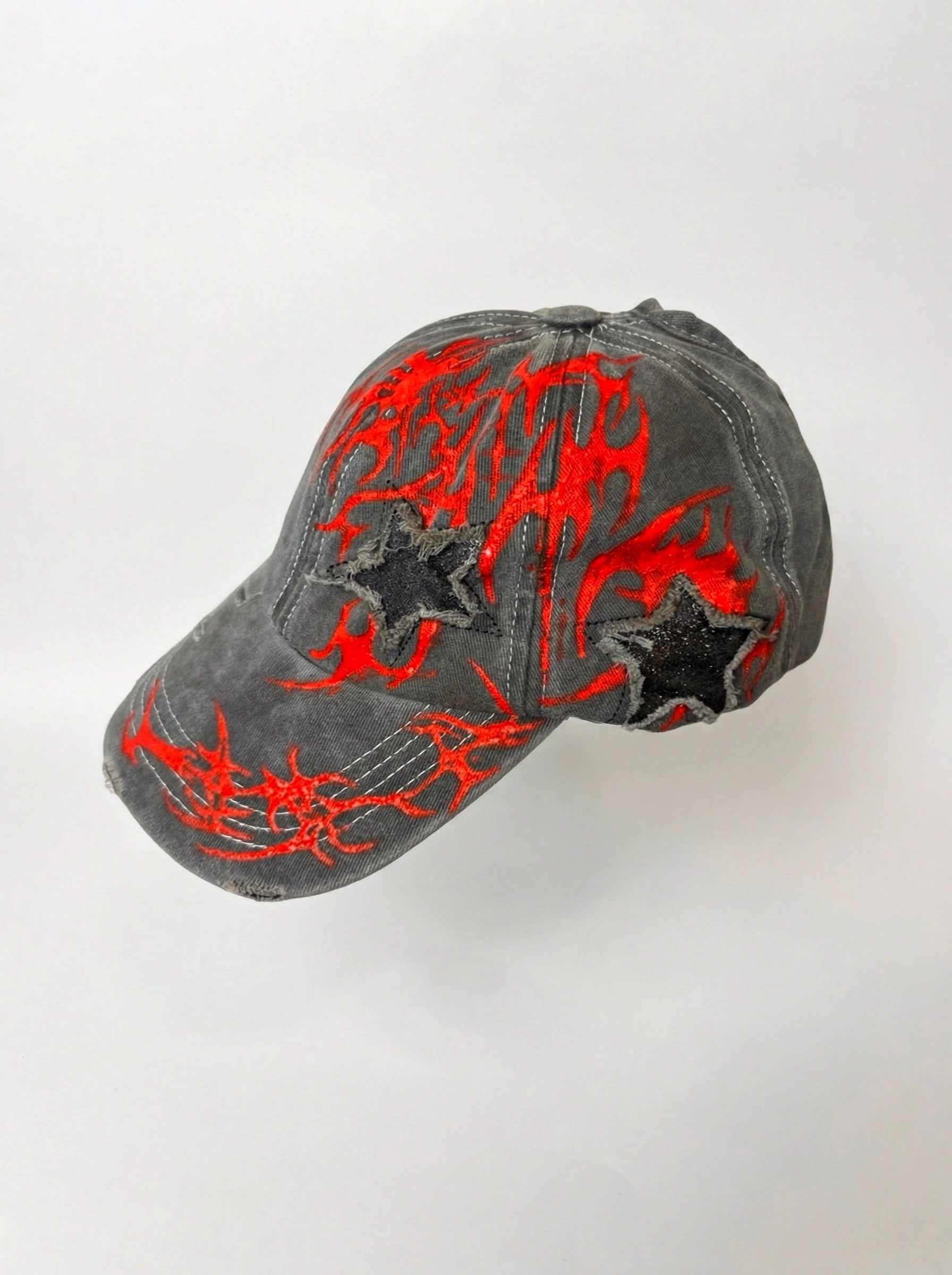 • Washed black vintage cap• Red flame sigil artwork• Raw-edge star cutout• Adjustable strap• One of one