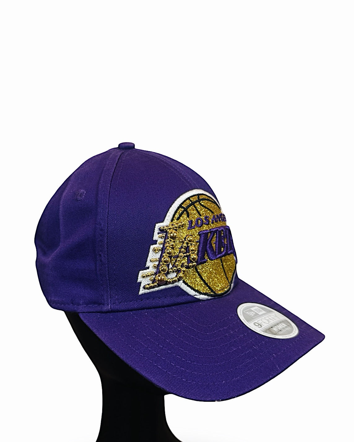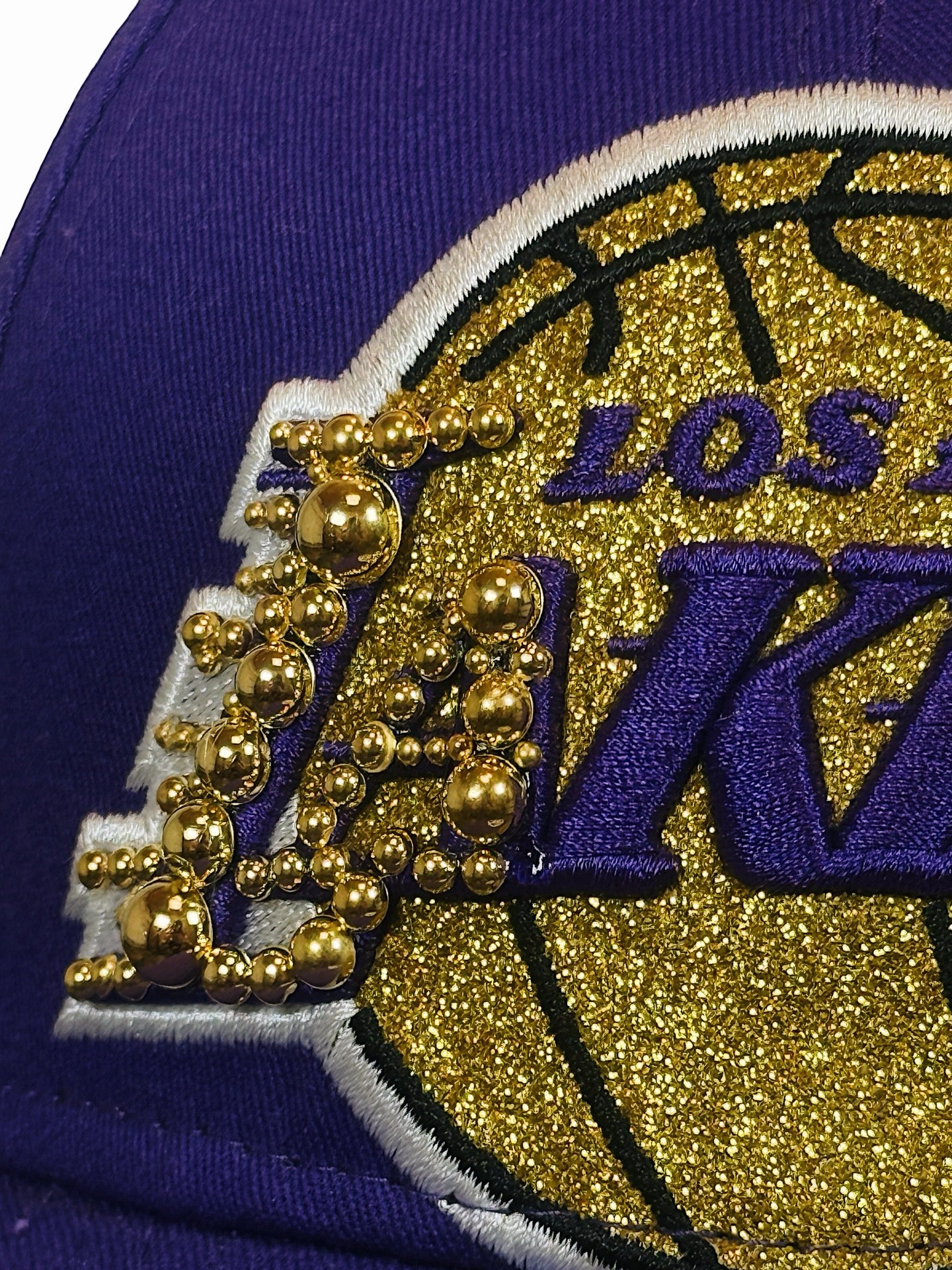 Original New Era adjustable 9FORTY cap, customized by hand with precision embellishments. The "LAKERS" lettering is given a unique texture using gold glitter and a layered trail of gold pearls.