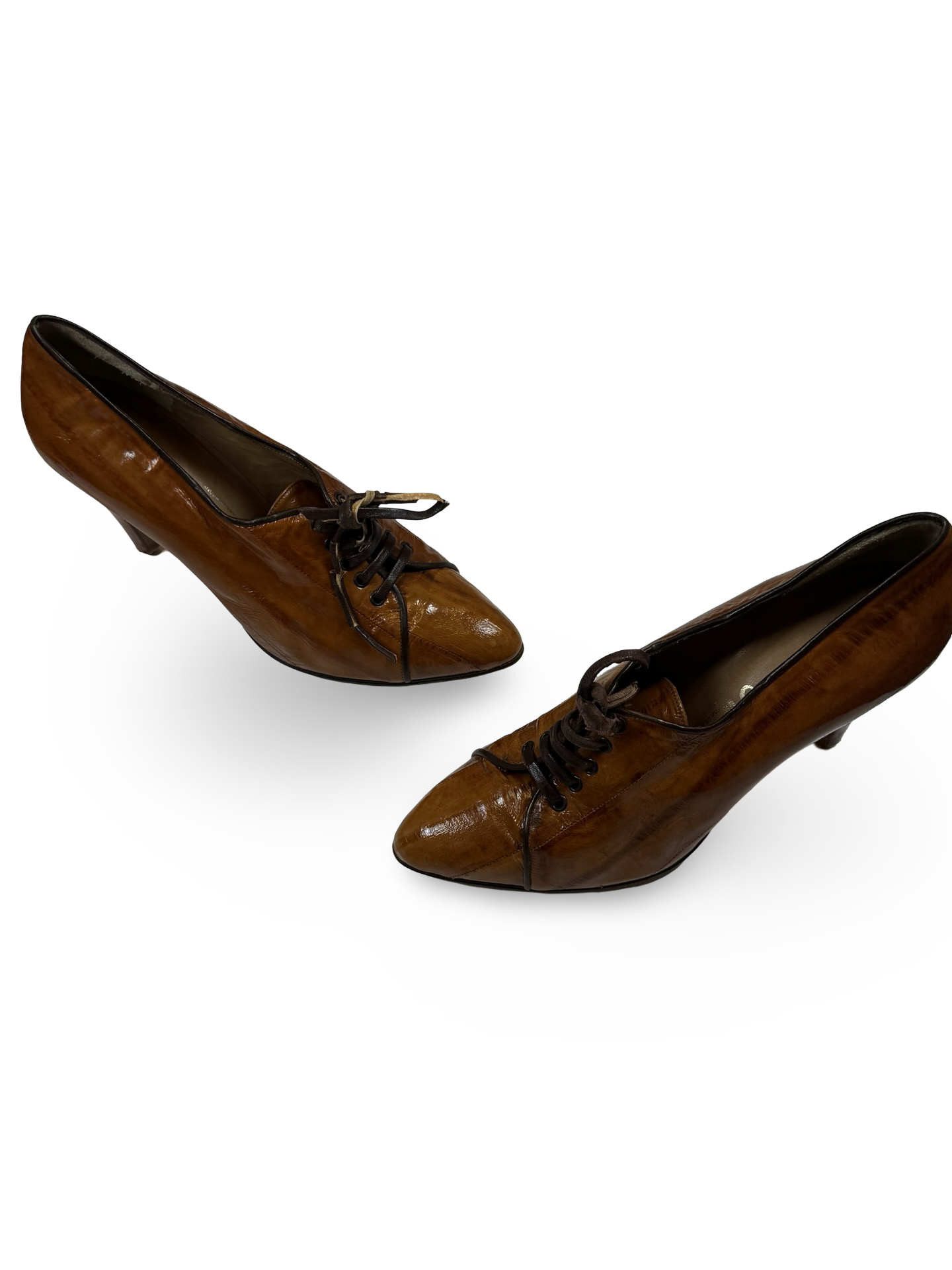 Handcrafted in Spain from 100% Legítimo Cuero (genuine leather), these vintage oxford-style heels embody timeless European craftsmanship. The caramel-brown patent finish carries a rich, natural patina that tells its age beautifully — a hallmark of true mid-century Spanish shoemaking. The lace-up silhouette blends femininity with utilitarian charm, offering a rare fusion of 1950s tailoring and artisanal detail.