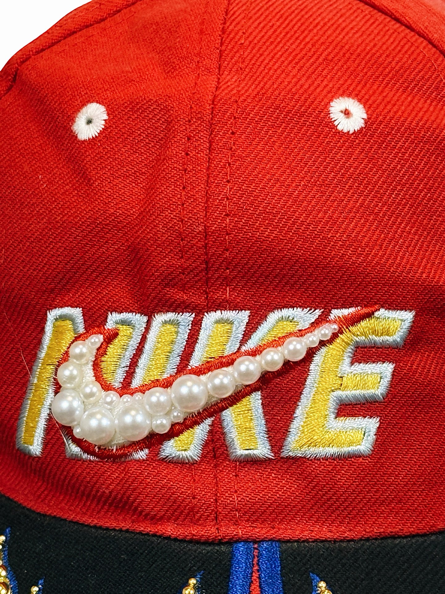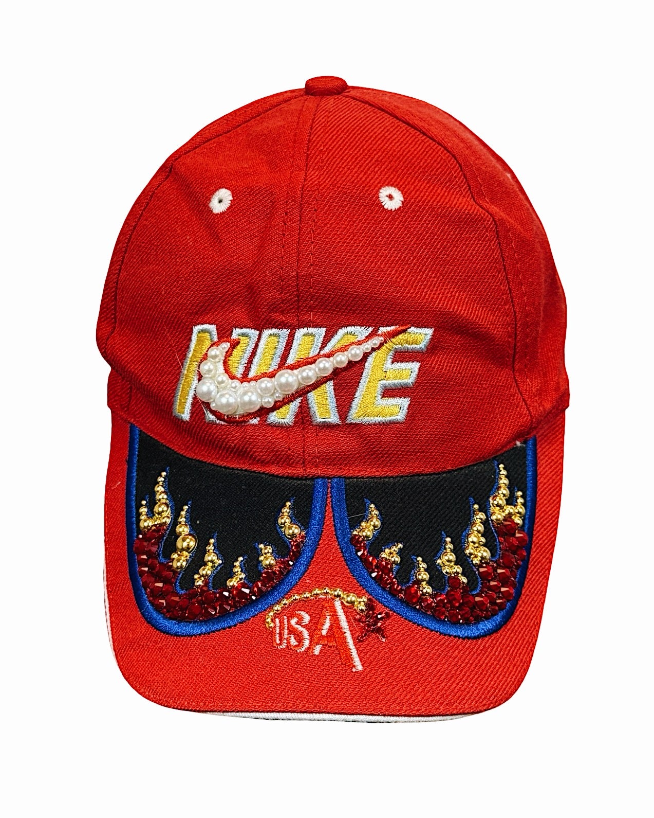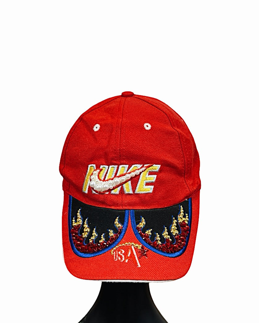 Red Nike USA embroidered cap reworked with technical embellishments. The Nike Swoosh has been overlaid with hand-set graduated pearls, arranged from small to large for dimensional structure. The embroidered flame sections on the brim are detailed with clustered rhinestones in red and gold, reinforced to follow the existing embroidery lines. Additional beadwork outlines the “USA” embroidery at the base of the brim.