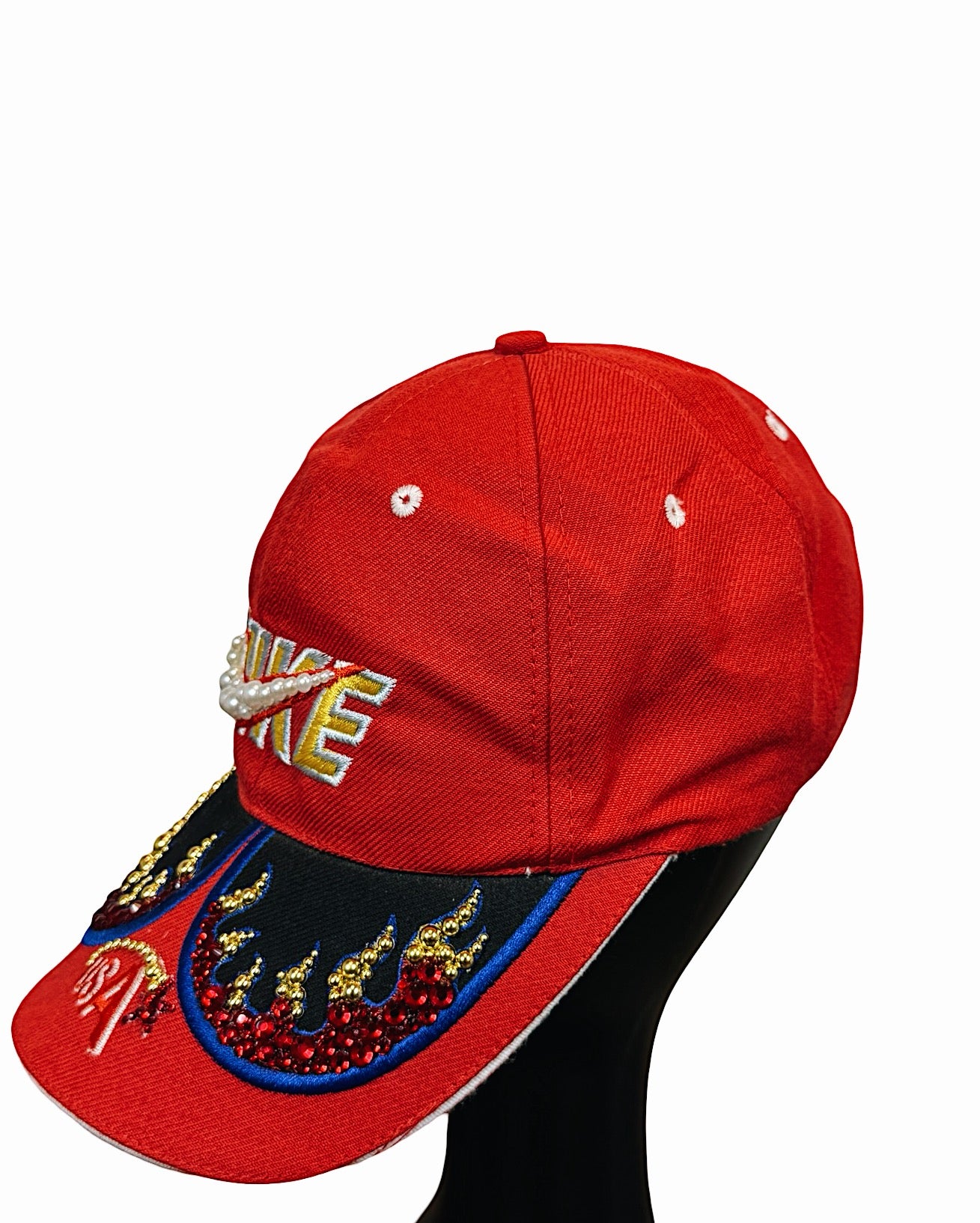 ✨ Keywords: custom Nike hat, pearl swoosh cap, rhinestone flame hat, USA embroidered cap, embellished Nike cap, Saint Oz 1of1, custom red Nike baseball hat.