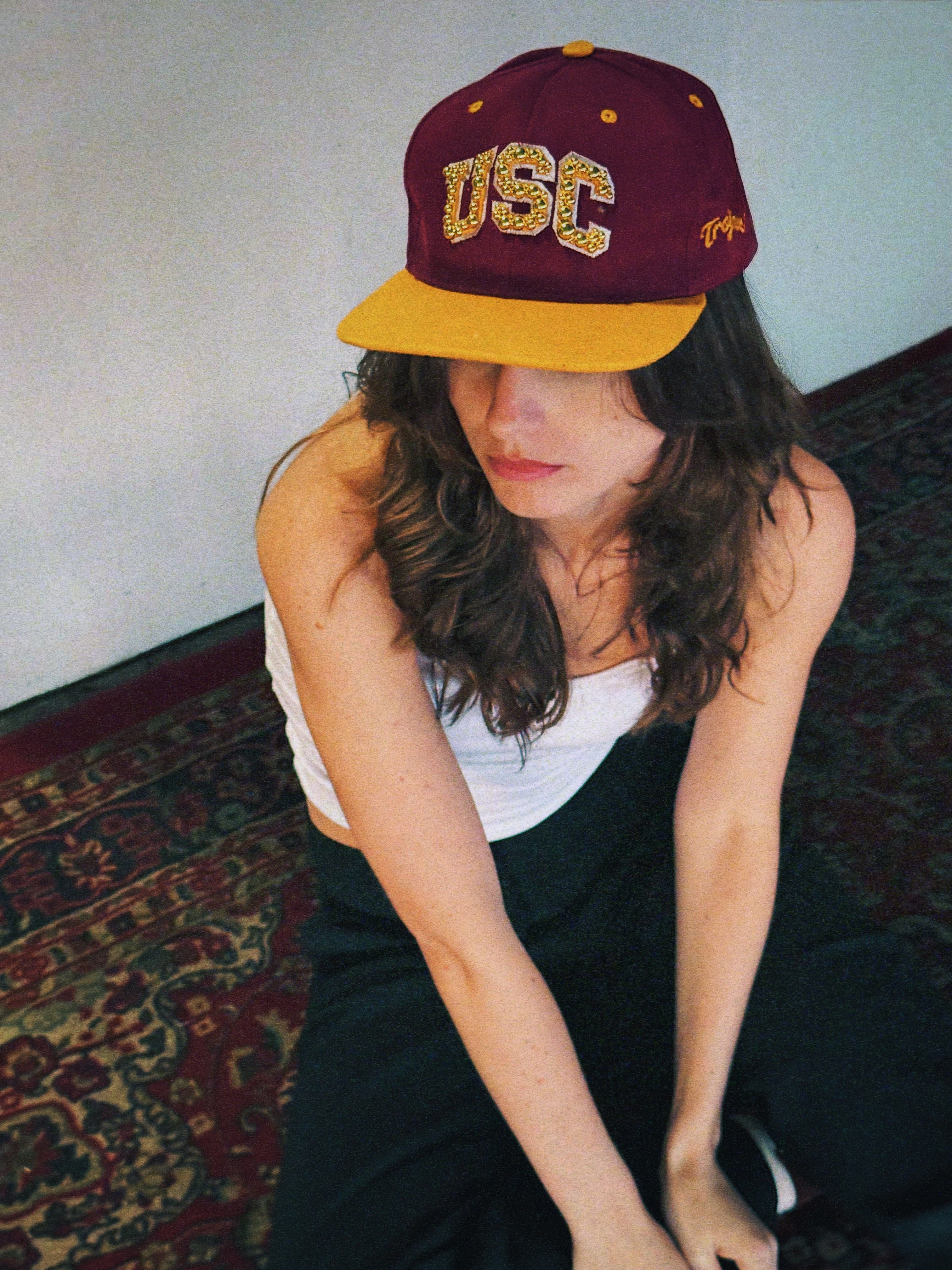 Original USC snapback, reworked with precise embellishments across the varsity “USC” lettering. Each letter is hand-upgraded using metallic gold pearls and crystal-clear rhinestones to add dimensional structure and shine.