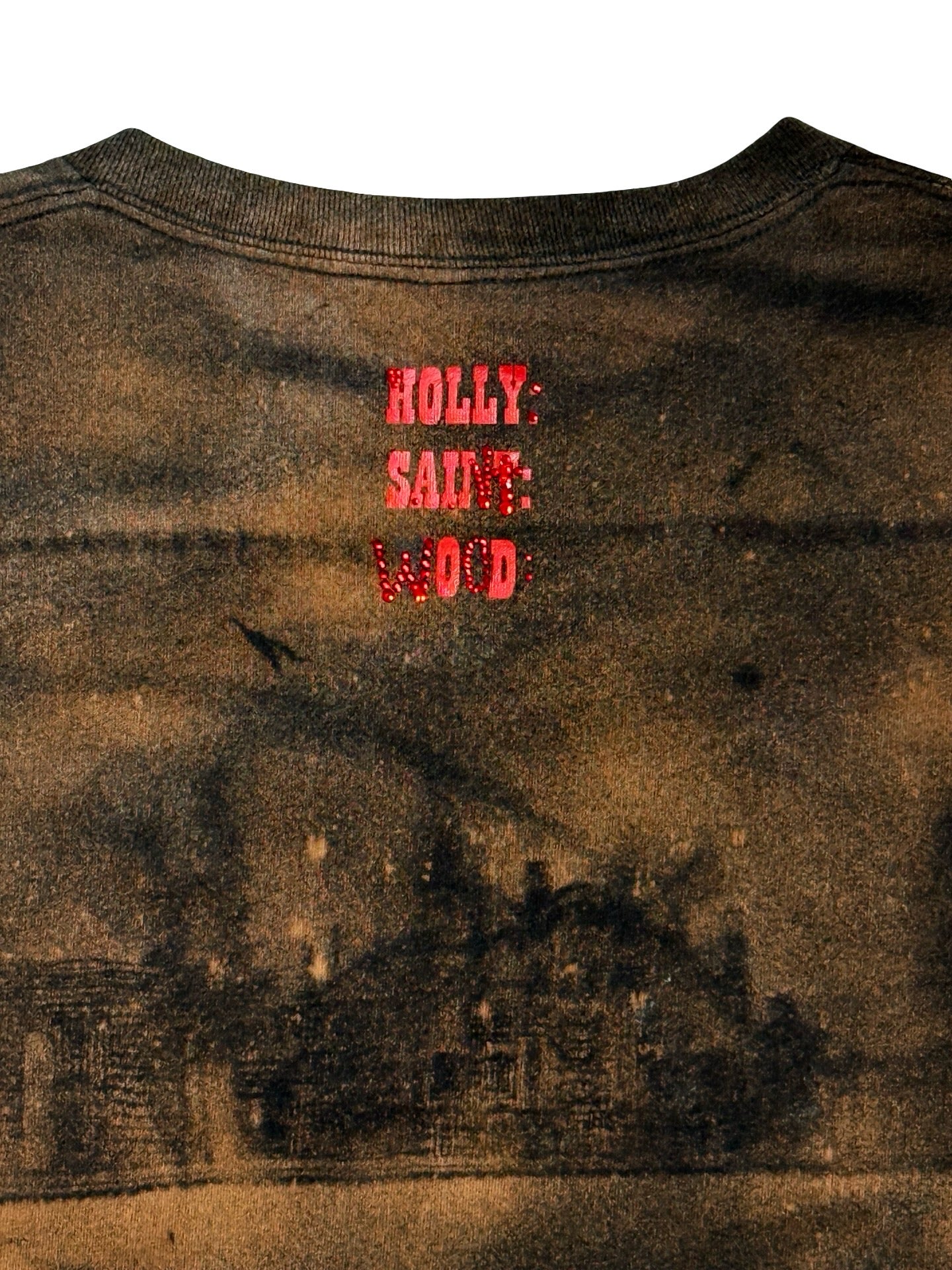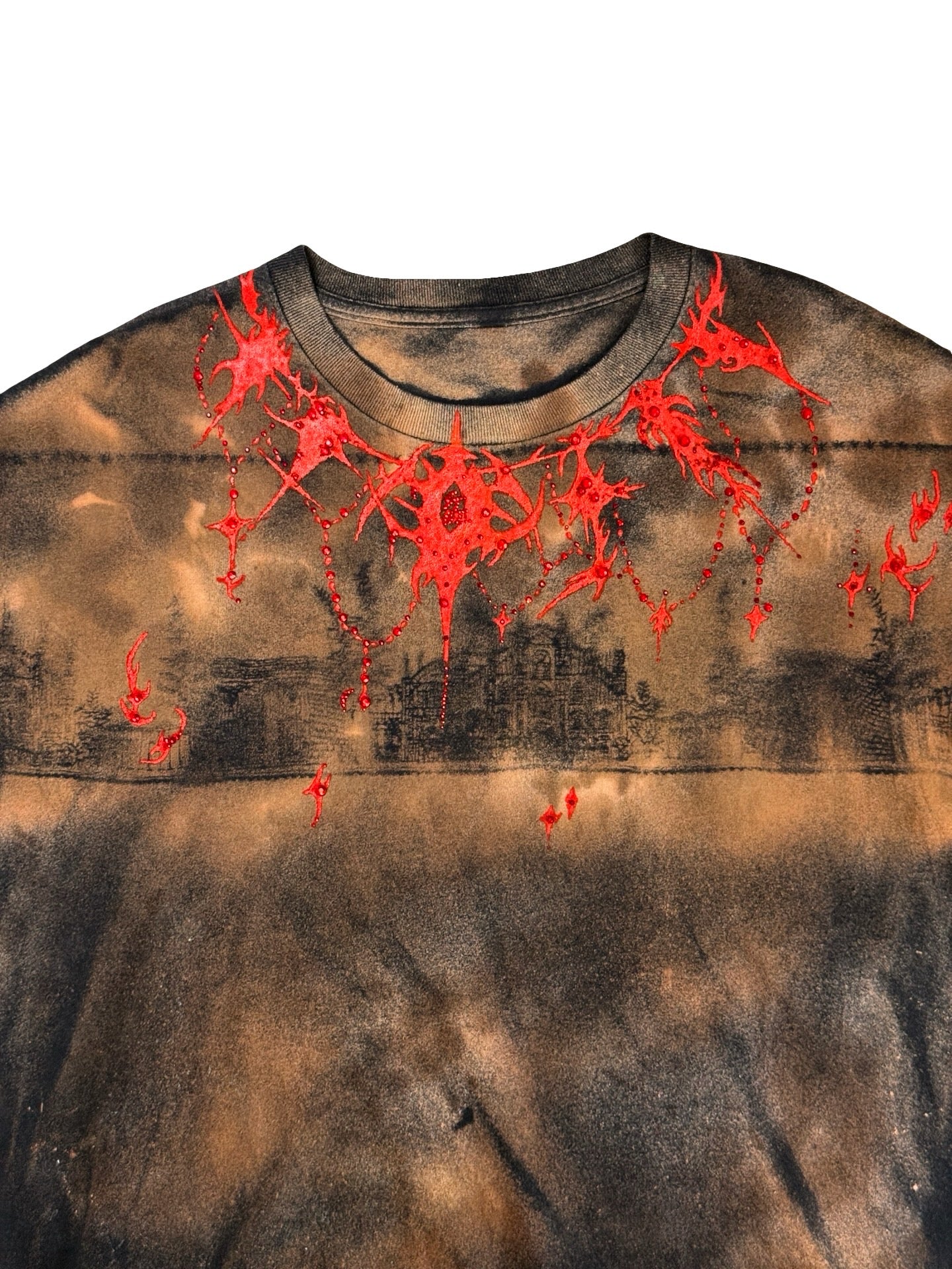 hand-bleached with unique burnt patterns and detailed with a hand-painted city skyline. Features Saint Oz’s signature cybersigilism + neo-tribal chain design across the chest, heat-set with red rhinestones for added texture and shine.